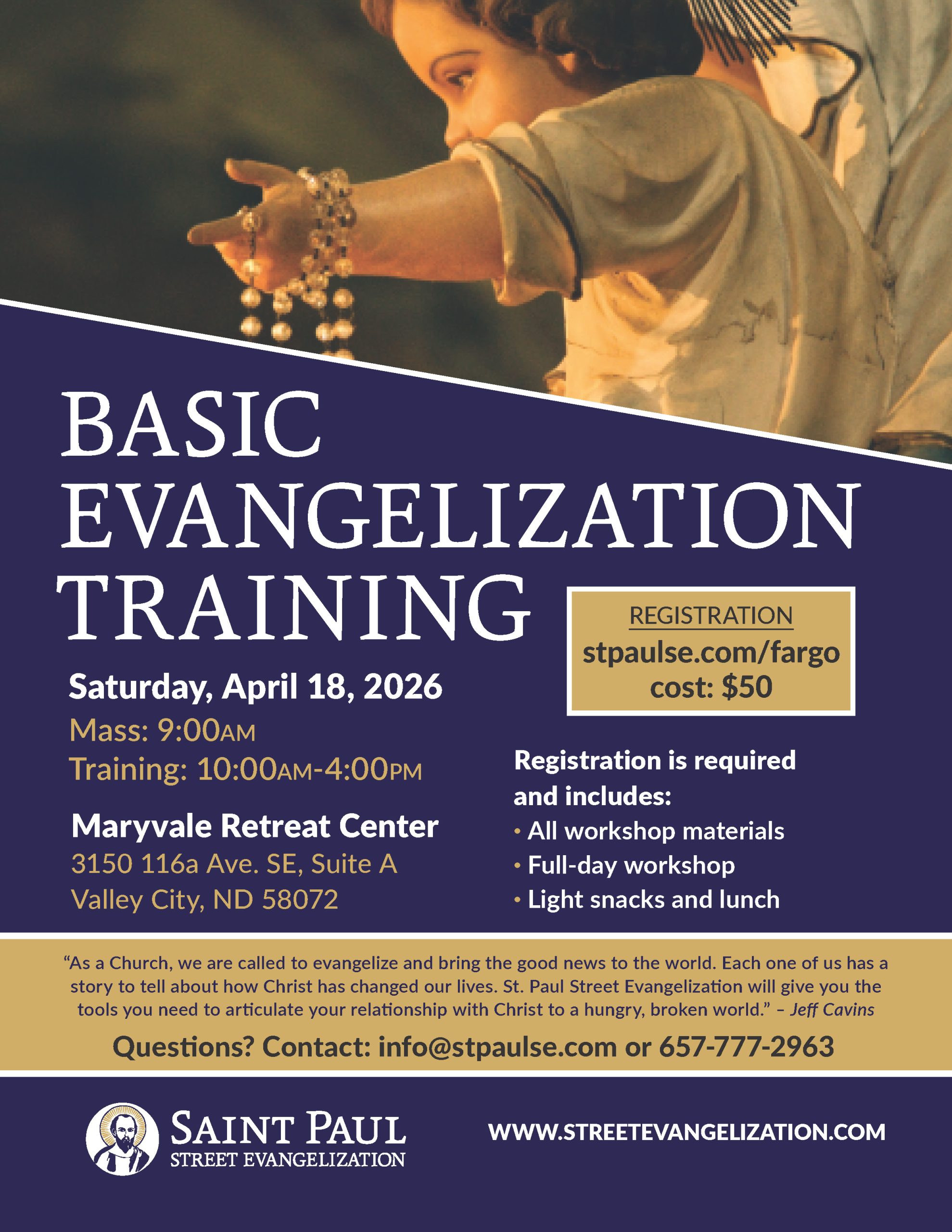 Registration is $50 per person. If you cannot afford the registration fee, please email adam@stpaulse.com and request a scholarship. No one will be turned away due to an inability to pay. Registration is required and includes: