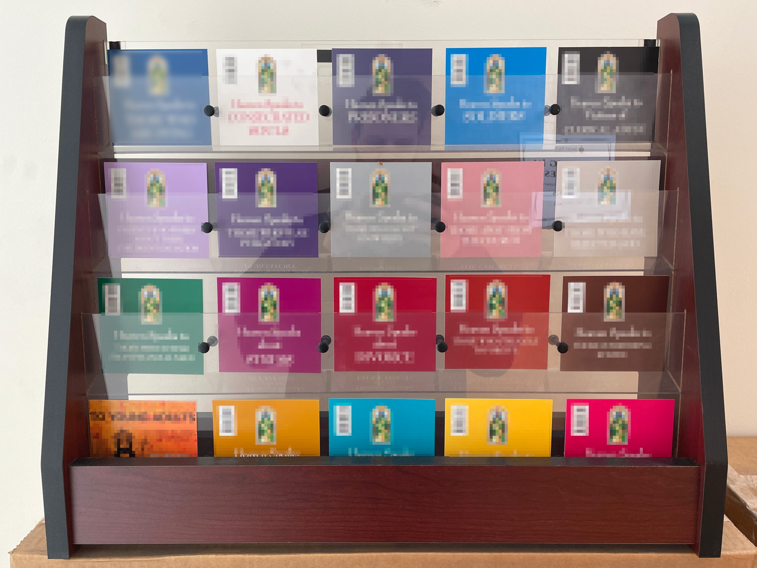We have a unique opportunity for you to help organize your pamphlets, rosaries, medals and other sacramentals either in your home, parish, or on your SPSE team table when you go out to evangelize. A company that distributes display racks for pamphlets and other materials currently has an excess of them. They wanted to give these excess racks to someone who could make good use of them. So, we had them ship 100 of these to us, in case our team leaders & evangelists could use them. They were given to us free of charge, and so they’re also free to you! All you have to do is just pay shipping.